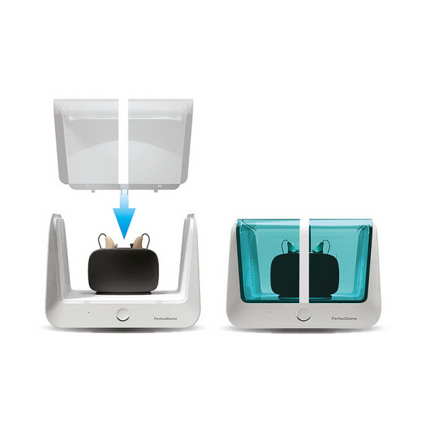 De PerfectDome is een droogsysteem met UV-C voor het dagelijks onderhoud van hoorapparaten en laadstations. In een cyclus van 60 minuten wordt de inhoud grondig gedroogd en tevens gedesinfecteerd door het UV-C licht dat de gehele cyclus in werking is.